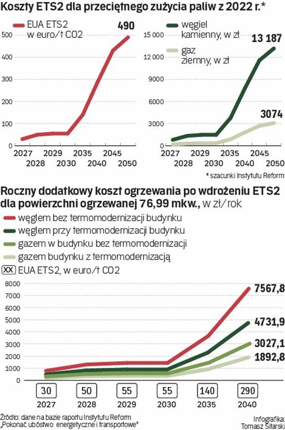 Chodzi o rozszerzenie systemu ETS, czyli handlu uprawnieniami do emisji CO2, który od 2027 r. miałby objąć także gospodarstwa domowe, transport drogowy, a także mniejszy przemysł. Zgodnie z tym planem, przedsiębiorstwa sprzedające paliwa kopalne w tych sektorach będą musiały nabywać uprawnienia do emisji CO2. A to wprost przełoży się na wzrost kosztów ogrzewania np. domów jednorodzinnych oraz na ceny paliw. Według wyliczeń ekspertów banku ING, zakup uprawnienia do emisji jednej tony CO2 za ok. 45 euro, przełoży się na wzrost ceny litra benzyny o 46 gr i o 54 gr za litr oleju napędowego. W przypadku kosztów ogrzewania węglem mogą one wzrosnąć – przy takiej samej cenie za uprawnienie – o 44 zł za MWh, a węgla nawet o 400 zł za tonę. Może to wpłynąć na wzrost kosztów ogrzewania domów jednorodzinnych średnio o 2 tys. zł w skali roku (o 25 proc.). Te koszty będą rosły wraz ze wzrostem ceny uprawnień do emisji CO2 na rynkach, co ma zachęcić do redukcji emisji nie tylko przez duży przemysł i energetykę, jak to jest obecnie (EU ETS1), ale także te mniejsze podmioty.