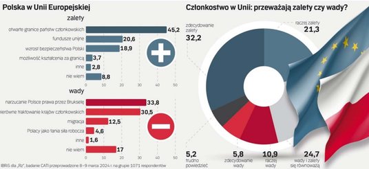 Tak wynika z sondażu IBRiS dla „Rzeczpospolitej”. W odpowiedzi na pytanie: „co przeważa – zalety czy wady członkostwa Polski w EU?”, zalety wskazało 53,5 proc. ankietowanych, a wady – 16,7 proc. Zdaniem 24,7 proc. wady i zalety się równoważą.