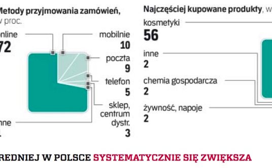 W Polsce wiodącą kategorią na rynku sprzedaży bezpośredniej są kosmetyki. W 2017 r. ich udział wyniósł 56 proc., co jest jak na Europę wynikiem bardzo wysokim. Jednak znaczenie tej kategorii systematycznie się obniża: gdy firmy zajmujące się sprzedażą bezpośrednią rozpoczynały podbój polskiego rynku, jej udział przekraczał 90 proc.