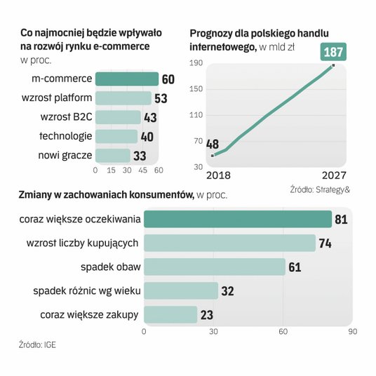 Z badania wynika, że zdaniem 60 proc. dyrektorów firm e-commerce w Polsce kluczowym trendem na rynku jest popularyzacja sprzedaży na urządzeniach mobilnych, a 53 proc. – rosnące znaczenie platform typu marketplace. Zdaniem 35 proc. to rosnąca sprzedaż w kanale konsumenckim, a dla 40 proc. technologie. Według badania Santander Consumer Banku z platform marketplace korzysta 72 proc. Polaków, najczęściej to Allegro czy OLX.