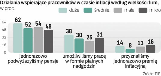 Z badania przeprowadzonego przez Polski Instytut Ekonomiczny wynika, że już ponad połowa firm jednorazowo podniosła pensje swoim pracownikom, a 48 proc. deklaruje przeprowadzanie podwyżek adekwatne do wzrostu inflacji. Mniej niż jedna trzecia przedsiębiorców oferuje pracę w formie płatnych nadgodzin, a 24 proc. zgadza się na dodatkowe benefity ograniczające wydatki (np. dofinansowanie dojazdów do pracy, bony do sklepów). Natomiast tylko kilkanaście procent firm przyznało pracownikom jednorazowo premię inflacyjną.
