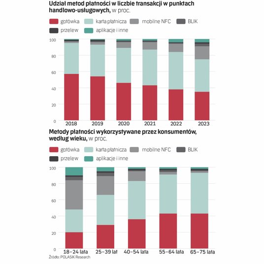 Rekordowo niski poziom 35 proc. wyniósł w 2023 r. udział płatności gotówką w liczbie transakcji zawartych w punktach handlowo-usługowych. Rok do roku to spadek o 3 pkt proc. Wobec 2018 r. aż o 22 pkt proc.
