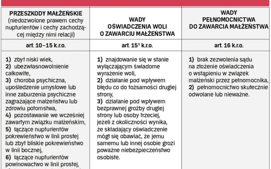 Uwaga! Brak którejkolwiek z wymienionych przesłanek sprawia, że w świetle polskiego prawa związek małżeński w ogóle nie został zawarty (nigdy nie zaistniał), a pożycie między nupturientami jest pożyciem pozamałżeńskim.