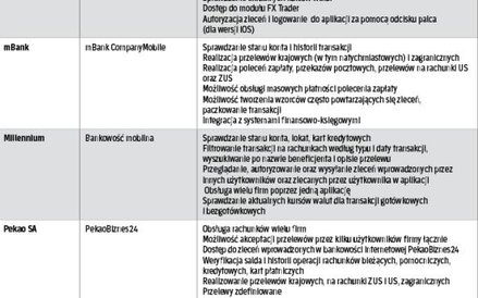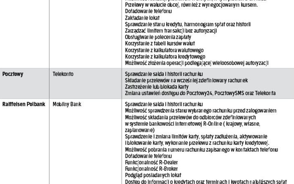 Sprawdzanie salda rachunku i historii operacji, możliwość realizacji przelewów czy śledzenie stanu i zmiany limitów kart płatniczych lub ich spłata to podstawa. Podobnie jak zakładanie przez telefon lokat czy występowanie o kredyt i kontrola terminów i wysokości najbliższych rat. Teraz liczą się także możliwości realizacji przelewów w walucie obcej, również z wynegocjowanym kursem, dostęp do platform walutowych, możliwości realizacji przelewów bez znajomości rachunku odbiorcy – na kontakt zapisany w telefonie. Jeżeli odbiorca ma rachunek w tym samym banku, pieniądze będzie miał natychmiast, jeżeli nie, dostanie sms-a z powiadomieniem, jak ma skorzystać z utworzonego dla niego tymczasowego konta, na którym czeka gotówka. Ważny stał się też dostęp do mapy oddziałów i bankomatów w przypadku, gdy zapomniało się karty, co jeszcze dwa lata temu było rzadkością. Niewiele natomiast aplikacji ma funkcję skanuj i płać, dzięki której można opłacić fakturę po zeskanowaniu z niej kodu QR.