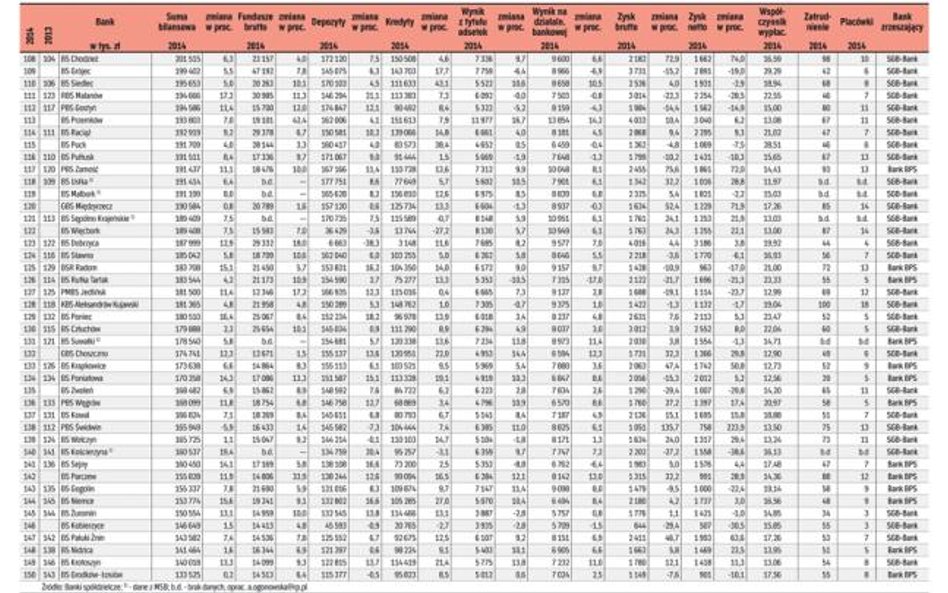 W 2014 r. ubyło sześć BS w efekcie dobrowolnych połączeń. Natomiast pod koniec kwietnia 2015 r. Komisja Nadzoru Finansowego zdecydowała o przejęciu BS w Zawierciu przez Śląski Bank Spółdzielczy Silesia w Katowicach. Był to pierwszy taki przypadek w sektorze od 2005 r.