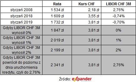 Oprocentowanie kredytów we frankach zwykle jest sumą marży banku i stawki LIBOR. Od 21 stycznia 2015 r. LIBOR wynosił od -0,96 proc. do -0,71 proc. W tym roku zaczął jednak niespodziewanie rosnąć. Jego obecny poziom -0,7024% (na dzień 11 stycznia) jest najwyższy od niemal czterech lat. - To oczywiście przełoży się na wzrost oprocentowania kredytów, choć nie stanie się to od razu. Zwykle banki tylko raz na trzy miesiące aktualizują oprocentowanie, uwzględniając aktualny poziom stawki LIBOR – dodaje Sadowski.