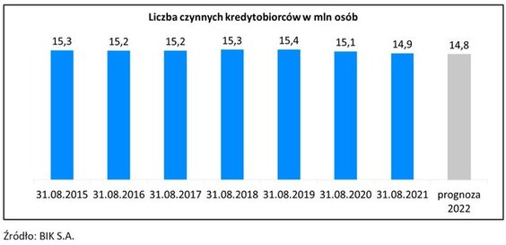 Jednocześnie z badania przeprowadzonego na zlecenie BIK wynika, że ponad połowa Polaków (57 proc.) w ogóle nie jest zainteresowana zaciąganiem kredytów, bez względu na zmiany polityki pieniężnej. Trend spadkowy liczby kredytobiorców finansujących się w bankach widoczny jest w danych BIK, z których wynika, że maleje ona sukcesywnie. Na koniec sierpnia tego roku było ich 14,9 mln, wobec 15,1 mln rok temu i 15,4 mln w sierpniu 2019 r.