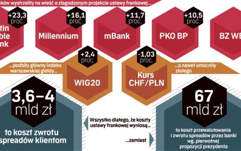 Prezydencka ustawa frankowa, wbrew obawom, nie zniszczy sektora bankowego. Potwierdziły się informacje „Rzeczpospolitej": przedstawiony we wtorek projekt okazał się dużo łagodniejszy niż zapowiedzi sprzed miesięcy. Przewiduje zwrócenie zadłużonym w walucie kredytobiorcom opłaty pobranej w ramach spreadów walutowych. Operacja ta ma kosztować banki 3,6–4 mld zł.