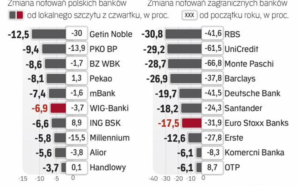 – Notowania polskich banków były pod presją negatywnego postrzegania całego sektora w Europie, nie ma szczególnej słabości polskich banków. W momencie gdy wszyscy chcieli uciekać od ryzykownych aktywów, połączenie słów „bank" i „rynek wschodzący" stało się sygnałem sprzedaży bez względu na sytuację fundamentalną – tłumaczy Piotr Miliński, analityk NWAI DM.
