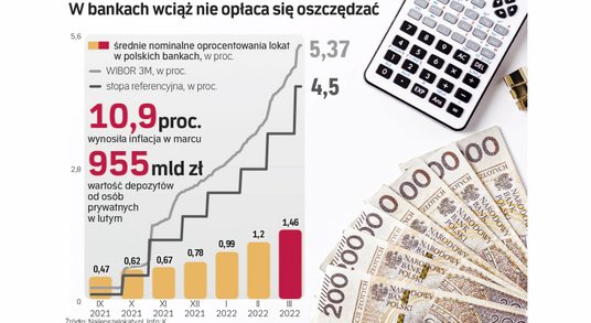 Tymczasem średnie oprocentowanie lokat jest nadal znacznie niższe niż stopy NBP. W marcu polskie banki komercyjne oferowały średnio tylko 1,46 proc., podczas gdy inflacja według wstępnych danych GUS wyniosła 10,9 proc., licząc rok do roku.
