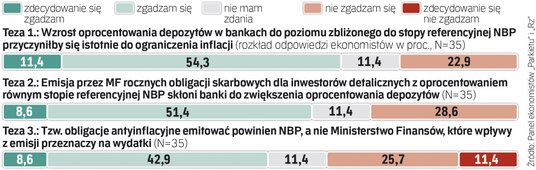 Z tezą, że „wzrost oprocentowania depozytów w bankach do poziomu zbliżonego do stopy referencyjnej NBP przyczyniłby się istotnie do ograniczenia inflacji”, zgodziło się 66 proc. spośród 35 ekonomistów, którzy wzięli udział w tej sondzie. W tym jednak tylko 11,4 proc. zgodziło się z tym stwierdzeniem zdecydowanie. W praktyce wiele zależałoby to od tego, na jakim poziomie byłaby główna stopa NBP. Uczestników sondy poprosiliśmy, aby założyli, że w obecnym cyklu zacieśniania polityki pieniężnej dojdzie ona do około 7–8 proc., tak jak oczekują obecnie uczestnicy rynku finansowego. Ankietowani ekonomiści oceniali więc, czy do ograniczenia inflacji może przyczynić się oprocentowanie depozytów wyższe niż dziś, ale wciąż ujemne w ujęciu realnym. To założenie miało wpływ na odpowiedzi.
