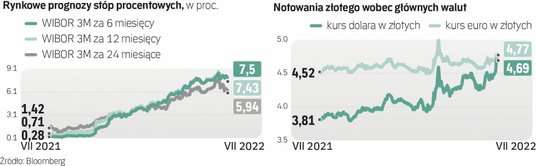 Inne wypowiedzi prezesa Glapińskiego na pierwszy rzut oka miały jednak raczej gołębi wydźwięk. I tak zostały zinterpretowane na rynku finansowym. Wskazuje na to gwałtowny spadek notowań kontraktów terminowych na stawki WIBOR, które są powiązane z oczekiwanym poziomem stopy referencyjnej NBP. Po konferencji prezesa banku centralnego inwestorzy spodziewają się, że trzymiesięczny WIBOR w horyzoncie pół roku sięgnie 7,5 proc. (w piątek wynosił niespełna 7,1 proc.). Dwa dni wcześniej, przed posiedzeniem RPP, na rynku oczekiwany był wzrost tej stawki do niemal 8,2 proc.