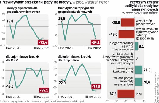 To duże negatywne zaskoczenie. O ile bowiem mniejsze zainteresowanie kredytami hipotecznymi było już widać od jakiegoś czasu, o tyle obecnie prawdziwe tąpnięcie jest oczekiwane także w przypadku kredytów konsumpcyjnych dla gospodarstw domowych oraz kredytów długoterminowych dla firm zarówno tych małych, jak i dużych.