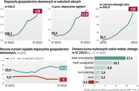 Ciekawe, że wraz ze wzrostem gromadzonych na kontach walut, w ostatnich miesiącach zaczęła spadać wartość depozytów złotowych: w czerwcu tego roku była niemal 1 proc. niższa niż rok wcześniej (spadek do ok. 910 mld zł z 919 mld zł rok wcześniej).