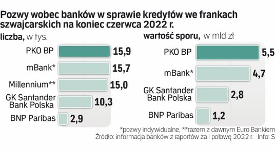 Podobną dynamikę widać w sprawozdaniach poszczególnych banków. Przykładowo PKO BP, instytucja, która udzieliła najwięcej kredytów we frankach, podaje, że na koniec czerwca tego roku przeciwko niej toczyło się 15,87 tys. postępowań sądowych (o łącznej wartości sporu 5,5 mld zł). To o 29 proc. więcej niż na koniec 2021 r. i o 77 proc. więcej niż rok wcześniej. Z kolei mBank informuje o 15,7 tys. pozwów indywidualnych, co oznacza wzrost odpowiednio o 20 i 56 proc.