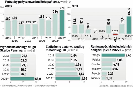 W projekcie ustawy budżetowej na 2023 r. Ministerstwo Finansów oszacowało, że potrzeby pożyczkowe brutto (czyli pieniądze, jakie rząd musi pozyskać na pokrycie bieżącego deficytu oraz na spłatę przypadającego przypadającego na dany rok zadłużenia), wyniosą niemal 270 mld zł, czyli ok. 8,1 proc. PKB. To pod względem nominalnym rekordowa kwota, a ekonomiści ostrzegają, że w praktyce może być znacząco wyższa.
