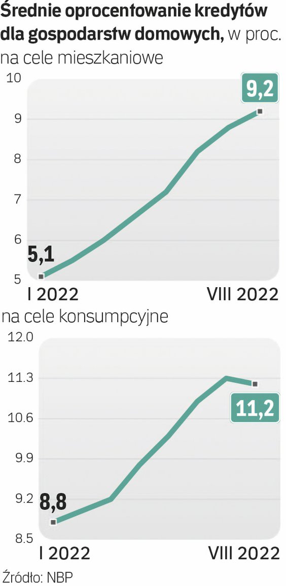 Także dane podawane przez NBP potwierdzają, że pożyczanie pieniędzy jest obecnie bardzo kosztowne. Oprocentowanie nowych kredytów dla gospodarstw domowych na cele mieszkaniowe wynosiło w sierpniu br. średnio 9,2 proc. wobec 2,9 proc. rok wcześniej, zaś na cele konsumpcyjne – odpowiednio 11,2 i 6,4 proc.