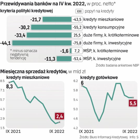W raporcie NBP na IV kwartał br. przewidywana jest też kontynuacja zaostrzenia kryteriów dla kredytów konsumpcyjnych oraz dalsze zaostrzanie kryteriów kredytowania przedsiębiorstw, zarówno tych dużych, jak i sektora MŚP. – Hamowanie gospodarki, w połączeniu z niepewnością, presją inflacyjną i kosztową dotyka wszystkich branż i sektorów. Nic dziwnego, że w takich warunkach banki będą przyglądać się wszystkim segmentom swojej działalności właśnie pod kątem ryzyka spłaty kredytu – zaznacza Sobolewski.