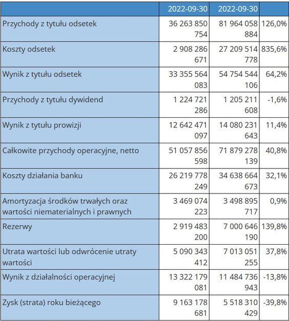 Wynik z tytułu odsetek wyniósł 54,75 mld zł, czyli wzrósł 64 proc. rdr, a wynik z tytułu prowizji 14,1 mld zł, rosnąc 11,4 proc. rok do roku.