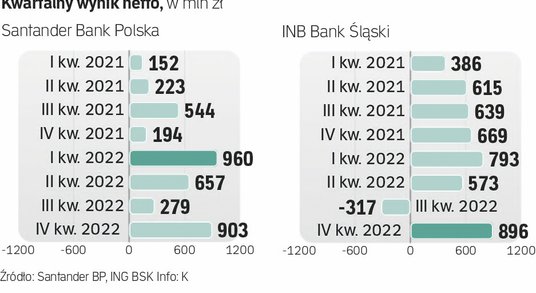 Także Santander Bank Polska poinformował w czwartek, że zysk netto za cały 2022 r. wyniósł 2,8 mld zł (wobec 1,1 mld zł rok wcześniej), a w IV kwartale – nieco ponad 903 mln zł (w III kwartale SBP należał do nielicznej grupy banków z zyskiem, który wyniósł ok. 280 mln zł). Prezes SBP Michał Gajewski komentował zaś, że wynik za 2022 r. jest na tyle solidny, że bank chce się nim podzielić z akcjonariuszami w formie dywidendy.