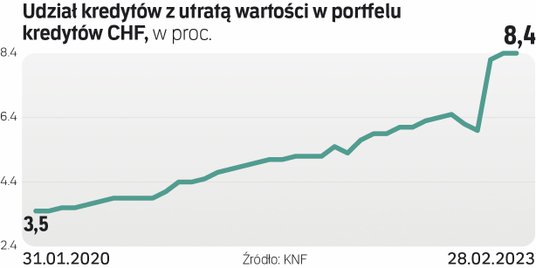 Na koniec lutego wartość kredytów mieszkaniowych we frankach szwajcarskich, które banki wrzuciły do tzw. koszyka 3, czyli należności ze stwierdzoną utratą wartości, wyniosła 4,2 mld zł, co stanowi aż 8,4 proc. hipotek w CHF dla gospodarstw domowych.