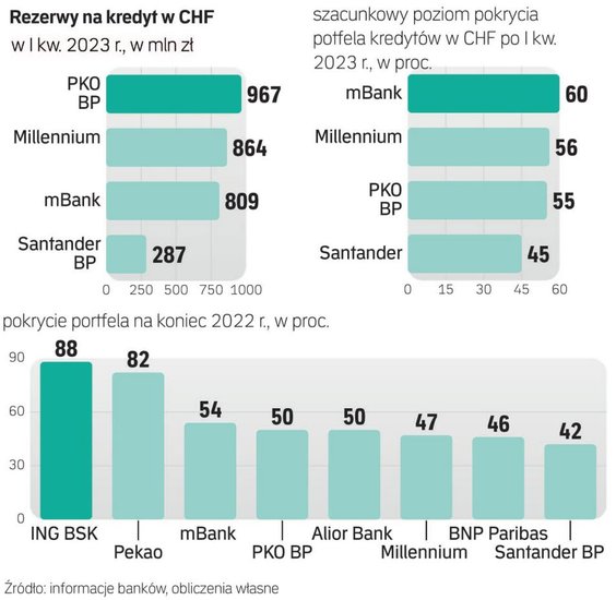 Dotychczas PKO BP, mBank, Bank Millennium i Santander BP poinformowały w swoich raportach bieżących o wysokości rezerw na kredyty w CHF utworzonych w I kwartale 2023 r. Największe odpisy poczynił lider rynku PKO BP – to 967 mln zł. W efekcie poziom pokrycia rezerwami całego portfela frankowych hipotek mógł wzrosnąć – według naszych szacunków – do ok. 55 proc., z ok. 50 proc. na koniec 2022 r.