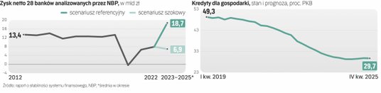 Jednocześnie NBP rysuje też znacznie mniej optymistyczne perspektywy dla sektora w tzw. scenariuszu szokowym. Tu potencjalne średnie zyski spadają do 6,9 mld zł w latach 2023–2025, czyli do poziomu z ostatnich lat. Przybywa też banków, które ponoszą straty, a niektóre z nich przestają spełniać wymogi kapitałowe. I wymagałyby dokapitalizowania na kwotę od 3,1 do nawet 8,8 mld zł.