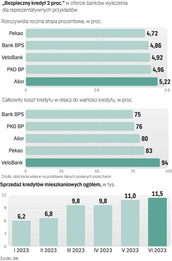 – Rzeczywiście, oprocentowanie „Bezpiecznego kredytu” jest realnie wyższe niż 2 proc. Nawet na stronie PKO BP pojawia się swoiste ostrzeżenie: „Pamiętaj, że »Bezpieczny kredyt 2 proc.« nie oznacza, że oprocentowanie Twojego kredytu musi wynosić 2 proc.” – przyznaje Wojciech Piesta, ekspert ds. produktów finansowych w rankomat.pl. – Wynika to z zapisów odpowiedniej ustawy o pomocy państwa w oszczędzaniu na cele mieszkaniowe i konstrukcji produktów finansowych w ramach programu „Pierwsze mieszkanie” – wyjaśnia.