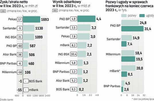 Sam PKO BP w II kw. zawiązał niemal 2,5 mld zł rezerw frankowych, co było bezpośrednią przyczyną jego dosyć słabego zysku. Podobnie było w przypadku innych banków, również mocno obciążonych tym problem – przykładowo Millennium Bank zarobił w II kw. 106 mln zł, czyli o 58 proc. mniej niż w rok wcześniej, a mBank miał 15 mln zł straty (choć w I kw. był 143 mln zł na plusie).