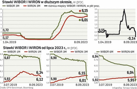 – Mówiąc w uproszczeniu, WIRON jest wskaźnikiem odzwierciedlającym przeszłą sytuację, a WIBOR jest wskaźnikiem wyprzedzającym, uwzględniającym oczekiwania co do zmian stóp procentowych – tłumaczy też Kamil Sobolewski, ekspert rynków finansów, główny ekonomista Pracodawców RP. Gdy więc Rada Polityki Pieniężnej – tak jak obecnie – wchodzi w cykl luzowania i cięcia stóp, WIBOR spada szybciej niż WIRON. I odwrotnie, gdy RPP zaczyna zacieśniać politykę pieniężną, WIBOR rośnie szybciej i jest wyraźnie wyższy niż WIRON (z czym mieliśmy do czynienia w zeszłym roku).