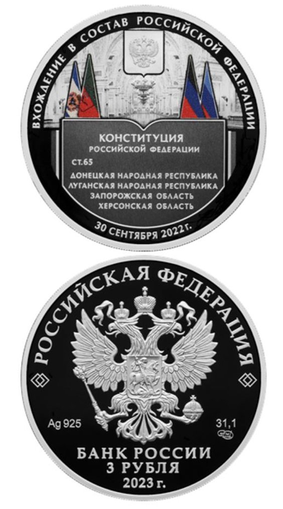 Bank Rosji poinformował w komunikacie w piątek, że wyemitował pamiątkową srebrną monetę o nominale 3 ruble z serii Wydarzenia Historyczne. Jej nazwa to: „Wejście do Federacji Rosyjskiej Donieckiej Republiki Ludowej, Ługańskiej Republiki Ludowej, Obwodu Zaporoskiego i Obwodu Chersońskiego”.