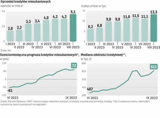 Potencjalna hossa na kredyty mieszkaniowe może wynikać więc przede wszystkim z oczekiwanego spadku ich cen, po tym jak Rada Polityki Pieniężnej na początku września dokonała zaskakująco dużej obniżki stóp procentowych (z 6,75 proc. do 6 proc.). Z badań „Monitora Bankowego” wynika, że saldo prognoz dla oprocentowania kredytów mieszkaniowych spadło we wrześniu do -78 proc. (wobec -38 proc. miesiąc wcześniej oraz wobec ponad +80 proc. na początku 2022 r.), co oznacza, że większość środowiska bankowego spodziewa się spadku kosztów pożyczania. Choć trudno powiedzieć, do jakiego poziomu.