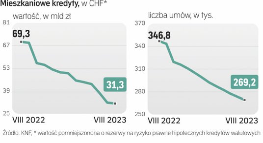 Na przykład mBank dokonał odpisów na ok. 1 mld zł, wobec 1,5 mld zł w poprzednim okresie, a Santander BP na ok. 0,3 mld zł, wobec ponad 0,7 mld zł. Lider rynku, PKO, nie przedstawił dotychczas komunikatu w tej kwestii i możliwe, że nie zawiązał istotnych rezerw frankowych w III kwartale, choć poprzednio było to aż 2,5 mld zł (za to mogą się pojawić duże kwoty w końcówce roku).