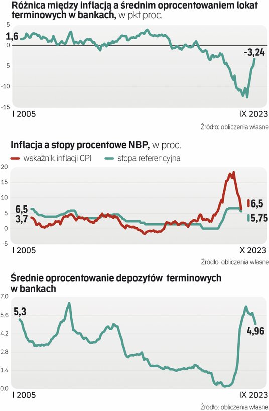 Również wyliczenia dotyczące realnych wyników z rocznych lokat potwierdzają, że sytuacja w tym względzie poprawia się. Jak podaje Jarosław Sadowski, główny analityk Expander Advisor, w październiku tego roku lokaty terminowe przyniosły 1,78 proc. realnej straty (ponieważ inflacja w październiku br. wynosiła 6,5 proc., a oprocentowanie lokat w październiku 2022 r. – średnio 5,68 proc.). To wciąż strata, ale stosunkowo niewielka w porównaniu z sytuacją sprzed roku, gdy oszczędzający byli realnie ok. 15 proc. na minusie.