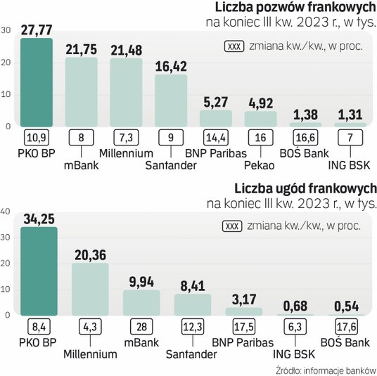 Najwięcej spraw w sprawach kredytów frankowych toczy się przeciwko PKO BP, bo też jest to bank, który swojego czasu udzielił najwięcej walutowych kredytów mieszkaniowych (spośród banków obecnie notowanych na giełdzie). Na koniec września miał już 27,8 tys. procesów, o 3 tys. więcej niż kwartał wcześniej.