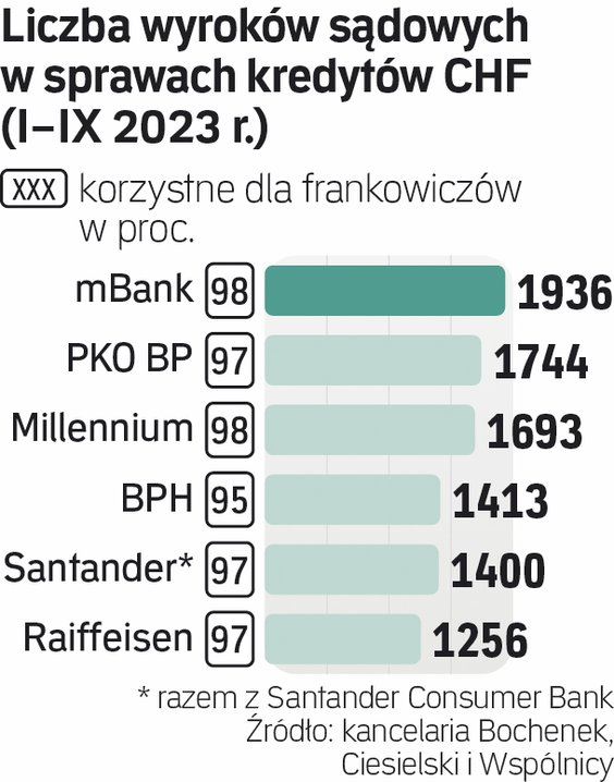 W okresie styczeń–wrzesień 2023 r. sądy wydały co najmniej 11 187 wyroków w sprawach frankowych – wynika z danych zebranych przez kancelarię Bochenek, Ciesielski i Wspólnicy. Mowa o liczbie minimalnej, ponieważ ogólna baza wyroków w tej kwestii nie istnieje, a kancelarie prawne zbierają dane „ręcznie”, śledząc na bieżąco sytuację.