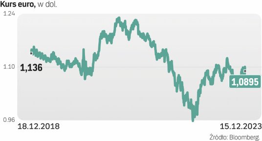 Jednak w prawdopodobnie już znajdującej się w recesji strefie euro dynamika cen konsumpcyjnych wyhamowała w listopadzie do 2,4 proc. i jest już niższa niż w spowalniającej, ale wciąż relatywnie silnej gospodarce USA. W rezultacie inwestorzy oczekują, że po pierwszą obniżkę stóp EBC sięgnie w kwietniu, choć Fed na takie posunięcie zapewne zdecyduje się już w marcu.