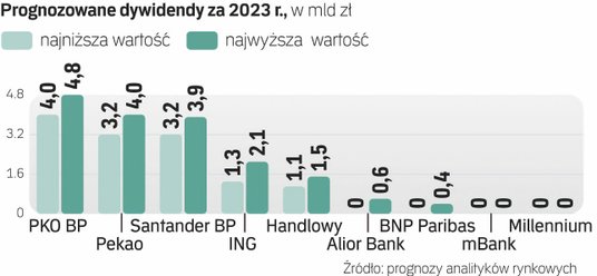 Jednocześnie analitycy podkreślają, że zaostrzenie kryteriów dywidendowych przez KNF nie wpłynęło negatywnie, może z nielicznymi wyjątkami, na oczekiwania rynkowe co do wypłat za 2023 r. Nikt bowiem nie spodziewał się, że banki przeznaczą 100 proc. swoich zysków dla akcjonariuszy. Wynika to z ich wewnętrznej polityki dywidendowej, a także ograniczeń związanych np. z ryzykiem prawnym kredytów CHF.