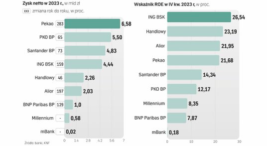 Z kolei mBank i Millennium uplasowały się na końcu zestawienia i w ich przypadku trudno mówić o rekordach. Zysk mBanku za cały 2023 r. to zaledwie 24 mln zł. Dobrze chociaż, że bank w ogóle wyszedł na plus wobec 700 mln zł straty w 2022 r.