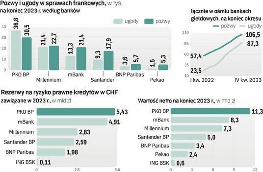 Po licznych w 2023 r., korzystnych dla konsumentów wyrokach TSUE w sprawach kredytów CHF można mówić wprost o lawinie pozwów. Łączna liczba spraw sądowych, które toczyły się na koniec minionego roku wobec największych banków notowanych na giełdzie, wynosiła już około 106,5 tys. – wynika z naszej analizy. To o 31,1 tys., czyli o 41 proc., więcej niż na koniec 2022 r.