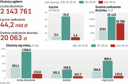 Z raportu Krajowego Rejestru Długów o rozkładzie zadłużenia Polaków w różnych grupach wiekowych i przyczynach ich kłopotów finansowych, który „Rzeczpospolita” poznała jako pierwsza, wynika, że zaległości konsumentów, które na dziś widać w KRD, wynoszą 44,2 mld zł. Średnie zadłużenie przypadające na osobę sięga 20,6 tys. zł. Najmocniej obarczeni niezapłaconymi rachunkami są konsumenci w wieku od 36 do 65 lat. Odpowiadają za ponad trzy czwarte całego zadłużenia. Ich konto obciąża 34,6 mld zł nieuregulowanych zobowiązań, a przeciętne zadłużenie wynosi 25,4 tys. zł.