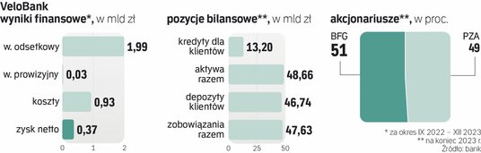 VeloBank to instytucja pomostowa powstała po przymusowej restrukturyzacji Getin Noble Banku. W 51 proc. jego właścicielem jest Bankowy Funduszu Gwarancyjny, czyli publiczny podmiot (na który składki łożą wszystkie banki). Pozostałe 49 proc. akcji jest obecnie w rękach podmiotu zarządzającego aktywami, który przejął ten pakiet w listopadzie 2023 r. od systemu ochrony banków komercyjnych. SOBK powstał w 2022 r., tworzy go osiem największych banków komercyjnych w Polsce (tj. PKO BP, Pekao, Santander BP, ING BSK, mBank, Millennium, Alior i BNP Paribas BP).