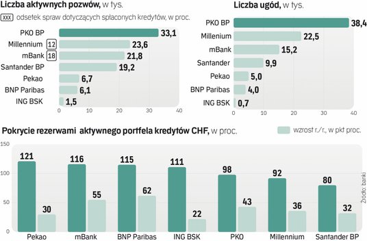 Najbardziej szczegółową informację w tym zakresie przedstawia mBank. I tak, w I kwartale 2024 r. liczba spłaconych już umów w CHF wchodzących w nowe postępowanie sądowe wynosiła 437, co stanowiło 23 proc. wszystkich nowych pozwów. W IV kwartale 2023 r. było to odpowiednio 377 i 16 proc., zaś w I kw. 2023 r. – 227 i 12 proc.
