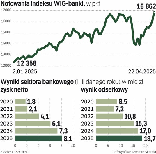 Na środowej sesji indeks WIG-banki w najlepszym momencie osiągnął 16 569 punktów i był tylko o 2 proc. niższy od swojego rekordu, który padł pod koniec marca tego roku. W środę rano rosły notowania wszystkich banków wchodzących w skład indeksu, choć po południu w niektórych przypadkach pojawił się kolor czerwony. Chodzi tu np. o Santander Bank Polska, którego kurs osiągnął historycznie wysoki poziom akurat dzień wcześniej, czyli we wtorek.