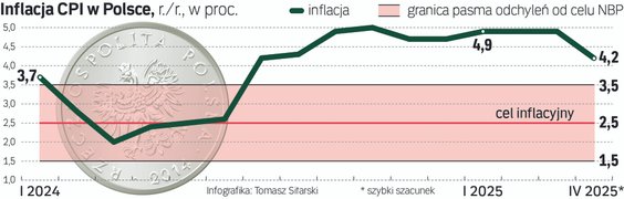 Mocno rozczarowała szczególnie marcowa produkcja budowlano-montażowa (spadek o 1,1 proc., średnia prognoz ekonomistów dla „Rzeczpospolitej” wynosiła +5,8 proc.), ale oczekiwaniom nie sprostały też dane o sprzedaży detalicznej (-0,3 proc. r./r. wobec średnich prognoz +0,3 proc.) i produkcji przemysłowej (+2,5 proc. r./r. zamiast spodziewanych +3,8 proc.). To wszystko sygnały, że w pierwszym kwartale 2025 r. polska gospodarka rosła nieźle, ale jednak wyraźnie poniżej oczekiwań Narodowego Banku Polskiego. W marcowej projekcji inflacyjnej NBP założył wzrost o 3,5 proc. r./r., tymczasem obecnie średnio ekonomiści ankietowani przez „Rzeczpospolitą” prognozują wynik w okolicach 3 proc. Co do zasady, niższy od oczekiwań wzrost PKB to mniejsza od spodziewanej presja inflacyjna dla gospodarki.