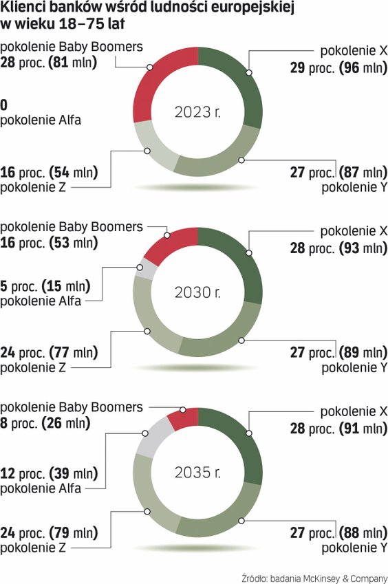 Przyspieszona zmiana pokoleniowa to jedno z największych wyzwań dla sektora bankowego. Jak wynika z analiz McKinsey&Company, już w 2035 roku pokolenia Z (urodzeni w latach 1995-2009) i Alfa (od 2010 r.) będą stanowić około 36 proc. klientów, podczas gdy obecnie to zaledwie 16 proc. W tym samym czasie udział Baby Boomersów (urodzonych przed 1965 r.) spadnie z 28 proc. do zaledwie 8 proc.
