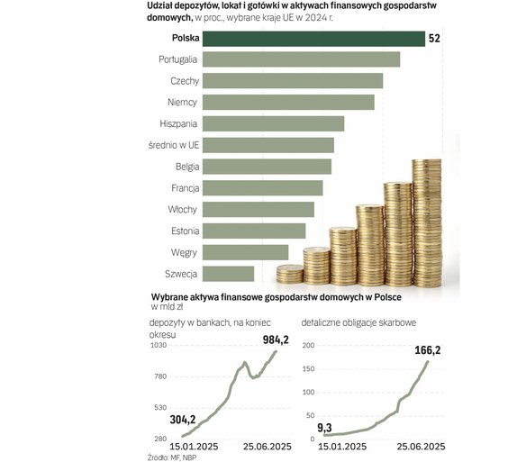 W instrumenty rynku kapitałowego, czy to bezpośrednio jeśli chodzi o zakup akcji notowanych na GPW, czy poprzez fundusze inwestycyjne lub emerytalne, płynie stosunkowo mało pieniędzy. Ministerstwo Finansów wyliczyło, że w 2024 r. aż 52 proc. aktywów finansowych gospodarstw domowych stanowiły depozyty, lokaty w bankach i gotówka, co dawało nam pod tym względem pierwsze, raczej niechlubne, miejsce wśród większych krajów UE. Dla Unii Europejskiej ten wskaźnik wyniósł średnio 30,6 proc., a np. dla Szwecji – tylko 12 proc.