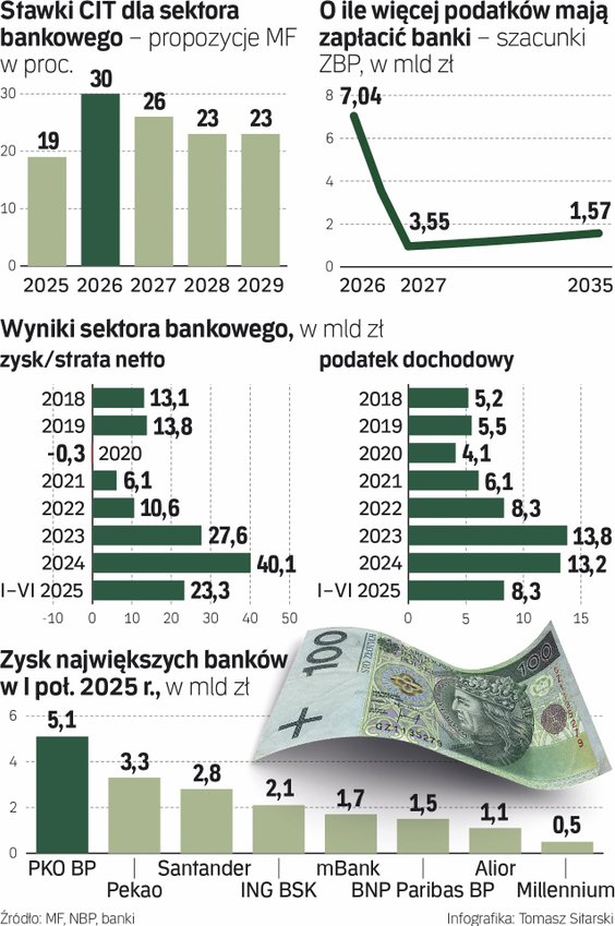 Ministerstwo Finansów planuje zmiany w opodatkowaniu sektora bankowego. W przyszłym roku stawka podatku dochodowego od korporacji CIT ma wzrosnąć z obecnych 19 proc. do 30 proc., w 2027 r. ma wynosić 26 proc., zaś począwszy od 2028 r. – 23 proc.