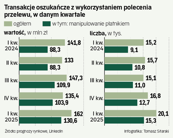 Z raportów NBP wynika, że w obrocie bezgotówkowym mamy coraz więcej transakcji oszukańczych. Tylko w I kwartale bieżącego roku ich liczba wzrosła rok do roku o ponad 7 proc. do 111 tys., a ich wartość – o ok. 15 proc. do 184 mln zł. Gdyby takie tendencje utrzymałyby się, w całym 2025 roku z portfeli Polaków mogłoby wyparować nawet 750 mln zł!