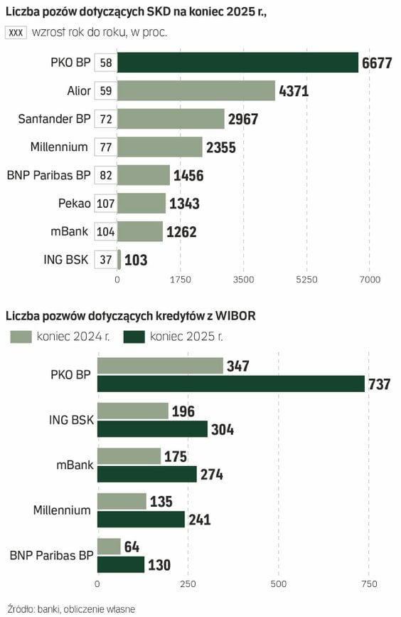 Podczas gdy saga frankowa powoli dobiega końca, otwiera się nowa linia sporów między klientami a bankami. Do końca 2025 r. przeciwko pięciu największym bankom – które raportują takie dane – wpłynęło 1686 pozwów kwestionujących kredyty mieszkaniowe oparte na wskaźniku WIBOR. Choć liczba ta może nie wydawać się imponująca, oznacza wzrost aż o 84 proc. rok do roku.